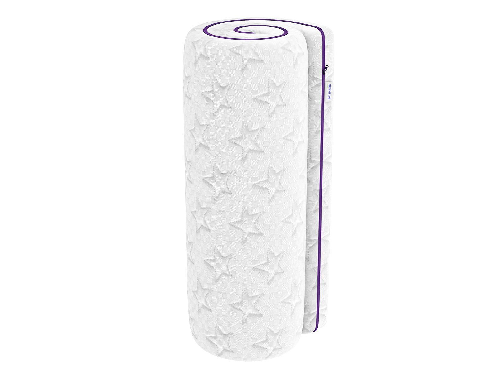 Для пошива чехла используется дышащий хлопковый жаккард. Материал украшает стёжка в виде звёзд по всем сторонам матраса. Стильное решение: вместо канта по периметру матраса вшита удобная смотровая молния в глубоком фиолетовом цвете.