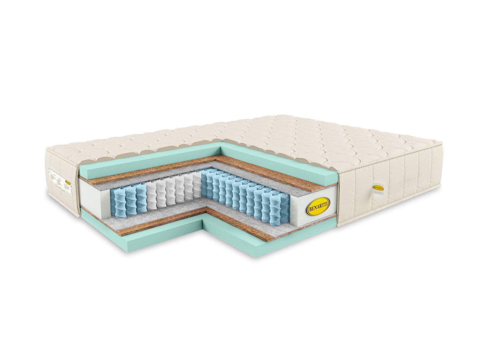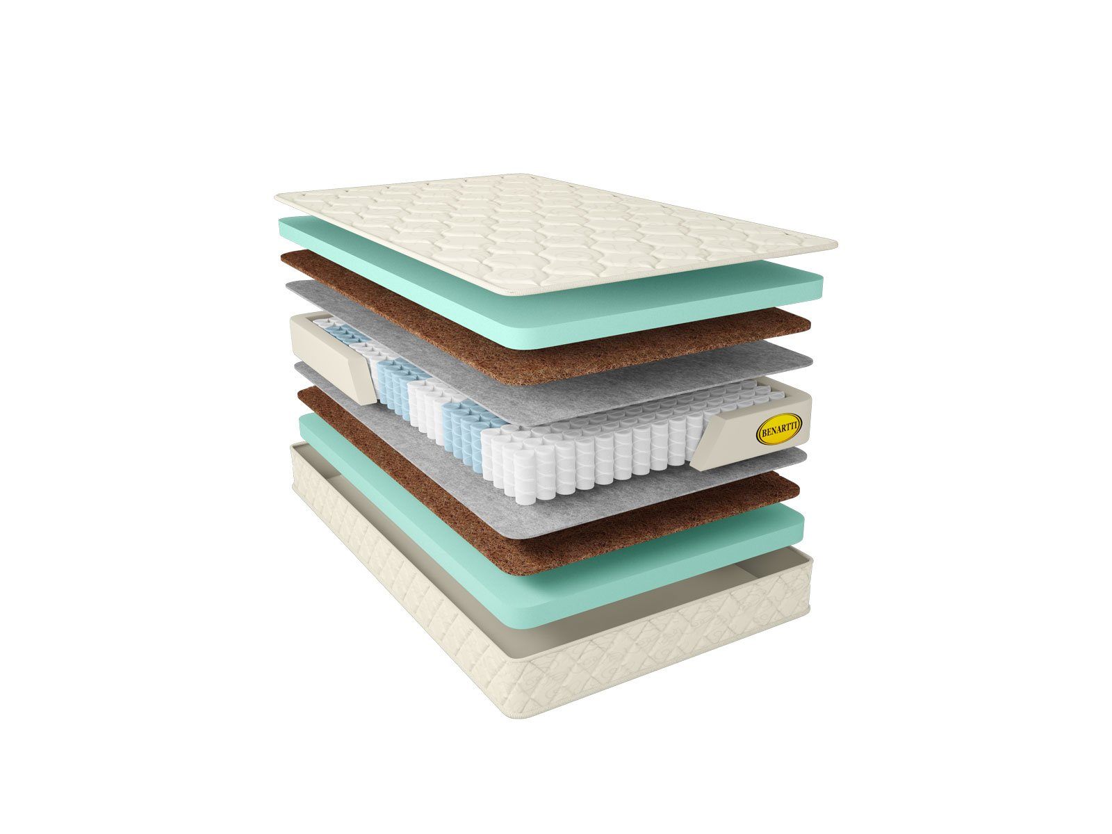 В качестве наполнителей в матрасе используется искусственный латекс в сочетании с кокосовой койрой. Материалы проложены в одинаковой пропорции с обеих сторон, что делает модель симметричной и с равной жёсткостью поверхностей. Если латекс отвечает за комфорт и удобство, то койра даёт качественную поддержку позвоночнику.