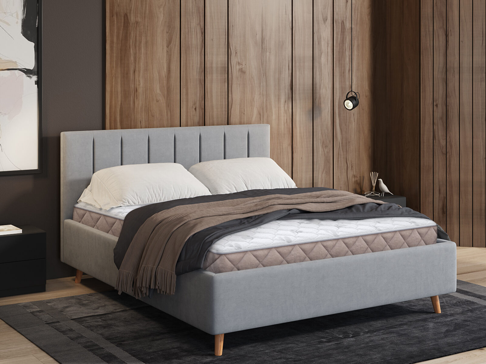 Кровать получила лёгкий и элегантный дизайн. Изголовье с мягкими вертикальными секциями украсит любую спальню и добавит уюта месту отдыха. Изящные наклонные ножки из дерева визуально облегчают конструкцию и обеспечивают просвет над полом, где легко пройдёт робот-пылесос. Корпус кровати выполнен из ДСП. Для обивки кровати используется велюр – мягкий и бархатный материал, который предпочитают ценители нежных прикосновений. В комплект входит ортопедическое металлическое разборное основание.