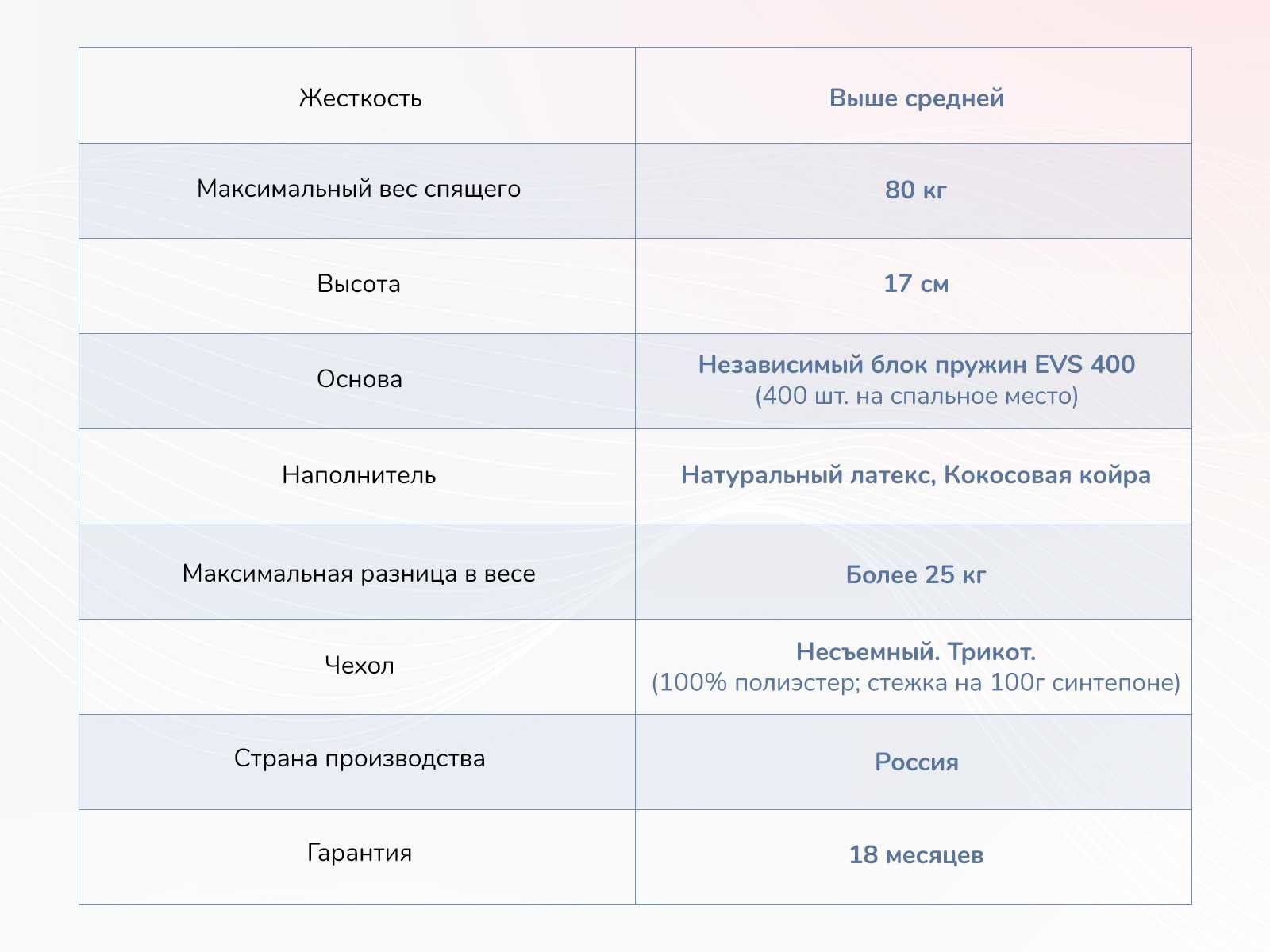 Спальную поверхность представляет пара натуральных наполнителей. Латекс и кокос – классические компоненты для качественного и удобного матраса.