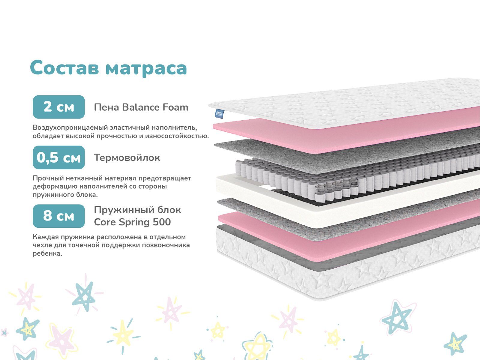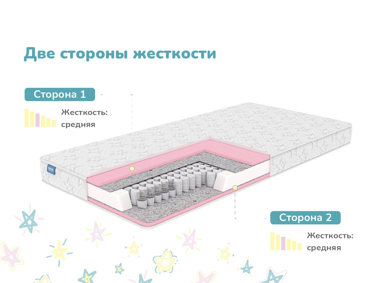 Матрас обеспечивает корректную поддержку для растущей спины ребенка, имеет удобную среднюю жёсткость и изготовлен из материалов, безопасных для детского здоровья.