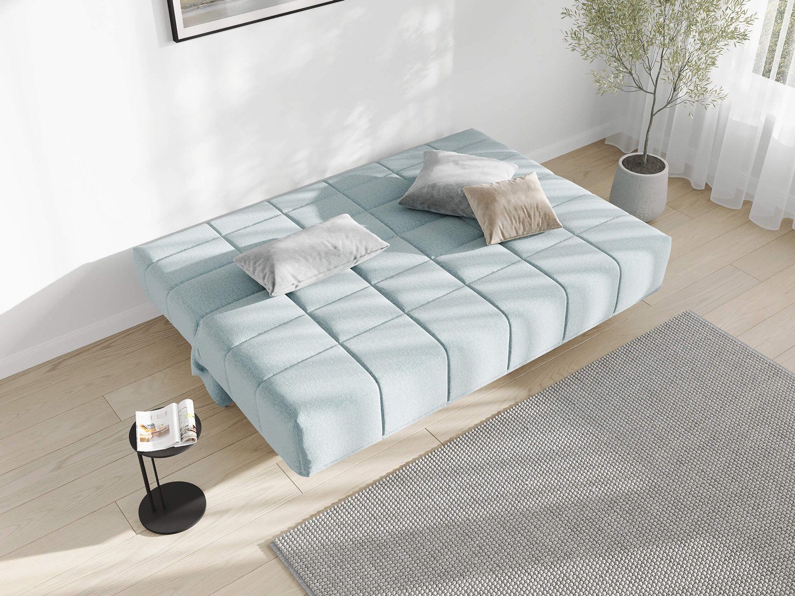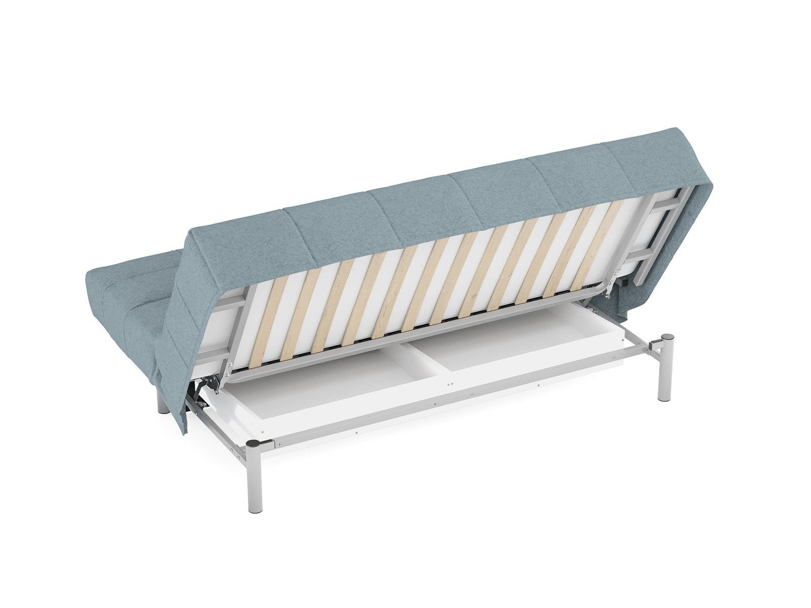 Диван для сна в современном стиле с механизмом трансформации «клик-кляк» и коробом для хранения. Основание дивана металлическое, с ламелями. Матрас анатомический с независимым пружинным блоком. Благодаря съемному чехлу с объемной стежкой в форме квадратов, диван органично впишется в современные интерьеры в стиле минимализм. Благодаря отсутствию подлокотников у дивана минимальные габариты как в сложенном, так и разложенном виде.