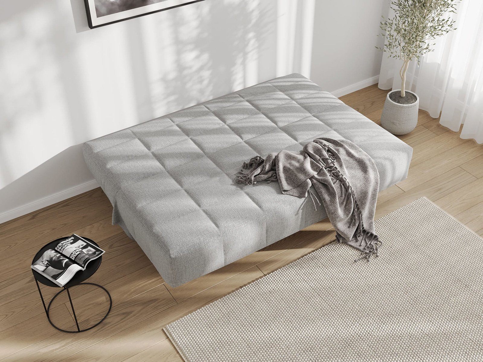 Диван для сна и отдыха в современном стиле с механизмом трансформации «клик-кляк». Основа дивана - металлическое основание с ламелями и анатомическим матрасом с независимым пружинным блоком. Благодаря съемному чехлу с объемной стежкой в форме квадратов, диван органично впишется в современные интерьеры в стиле минимализм. Благодаря отсутствию подлокотников у дивана минимальные габариты как в сложенном, так и разложенном виде.