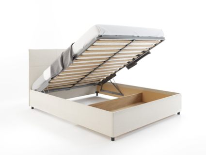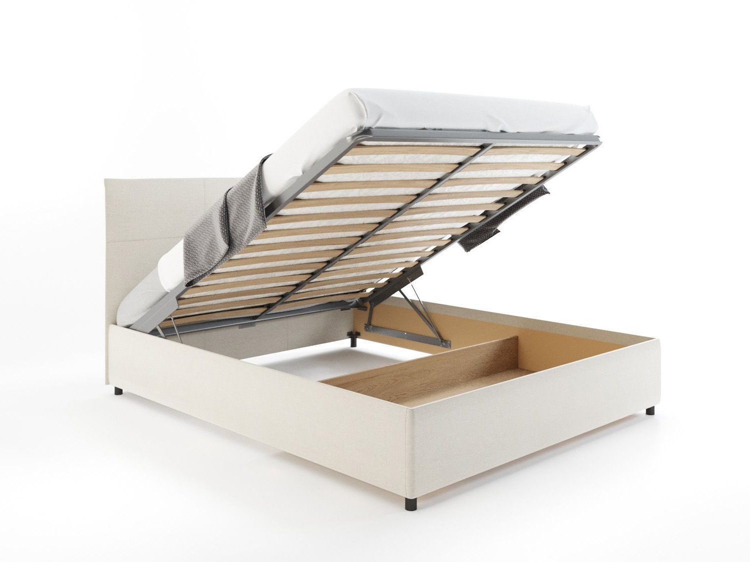 Каркас изголовья и царги кровати изготовлены из ДСП. Модель укомплектована подъемным механизмом с двумя газовыми амортизаторами. Опционально - кровать может быть укомплектована только металлическим основанием под матрас (без подъёмного механизма) или вовсе без основания и подъёмного механизма. Отсек для хранения постельных принадлежностей с вкладным полом на 1/2 кровати.