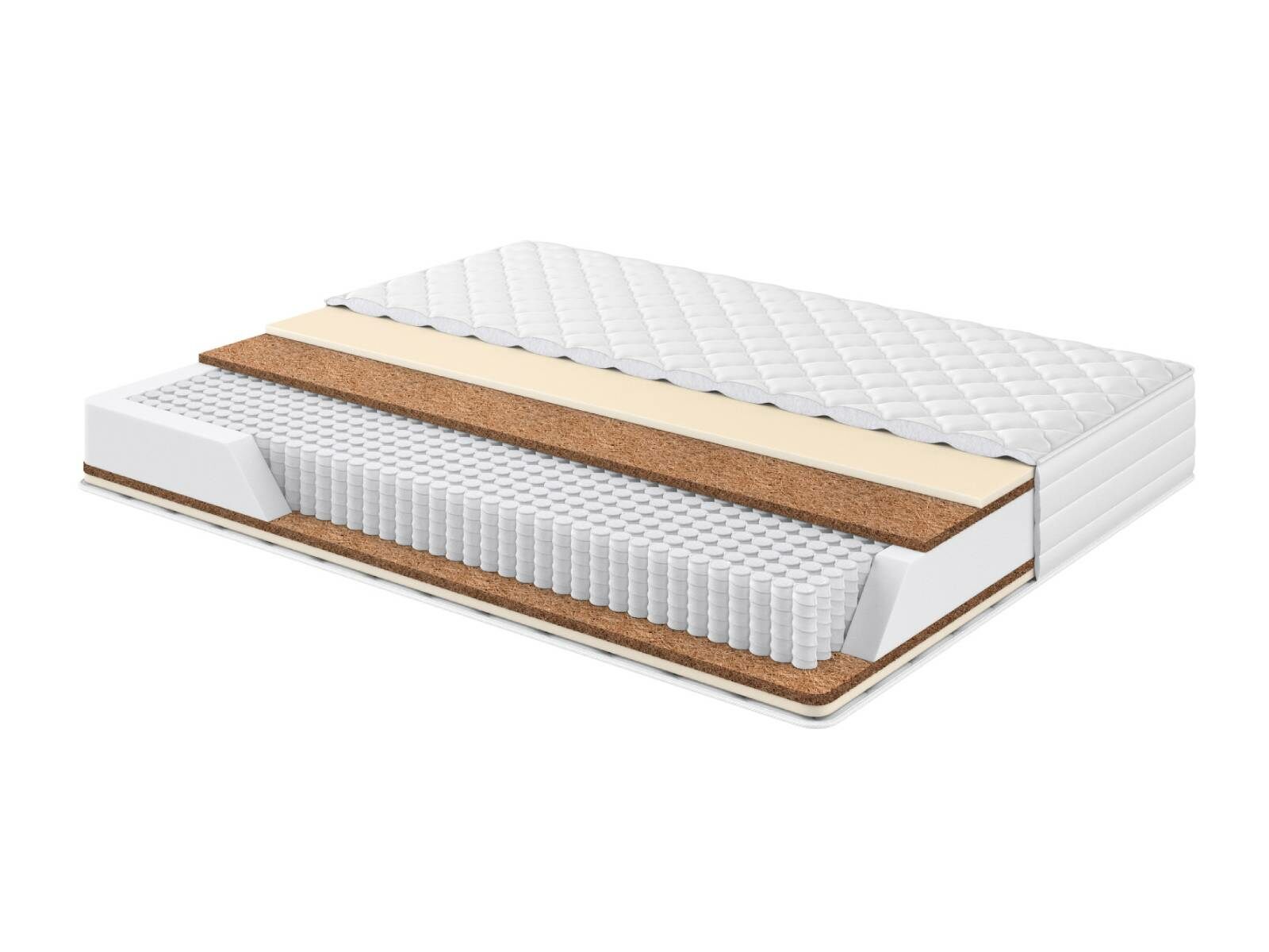 Матрас Премьер средней жёсткости, состоящий из классических наполнителей в виде латексной пены и кокосовой койры, а также усиленного пружинного блока. Независимые стальные пружины диаметра 3,8 см. четко подстраивается под вашу фигуру, удерживая тело в здоровом положении на протяжении всего времени отдыха. Слой 2-х сантиметровой кокосовой койры делает матрас более упругим, в то же время, способствует увеличению срока службы пружинного блока. 2 см латекса отвечают за уют и анатомические свойства матраса.