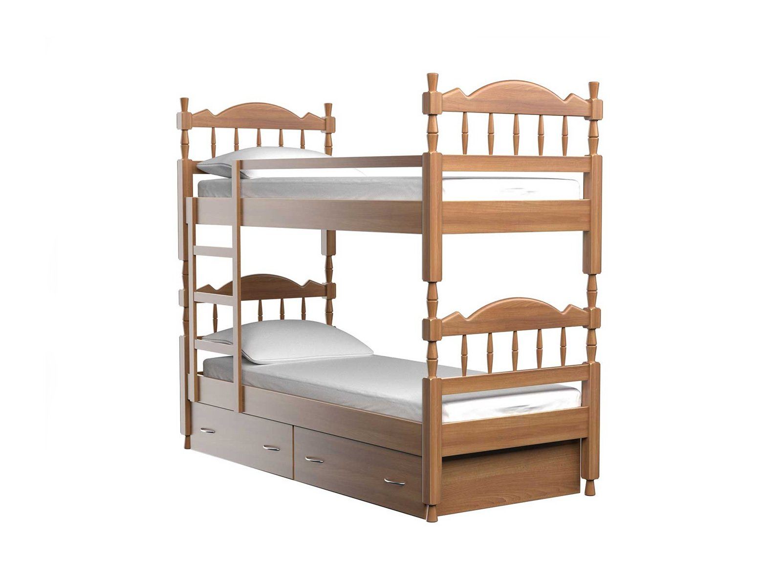 Удобная двухъярусная детская кровать с ящиками для хранения постельных принадлежностей и надежно закрепленной лестницей. Для обеспечения безопасности ребенка второй ярус оснащен бортиком-ограничителем, исключающим падение ребенка во время сна. Деревянная кровать из массива бука выполнена по индивидуальной технологии. Детская кровать подарит больше пространства и идеально впишется в интерьер детской комнаты. Вместительные встроенные ящики прекрасно позаботятся об игрушках и постельных принадлежностях. Кровать полностью выполнена из натурального дерева. Кровати из массива ценных пород дерева – гарантия экологической чистоты в Вашем доме.