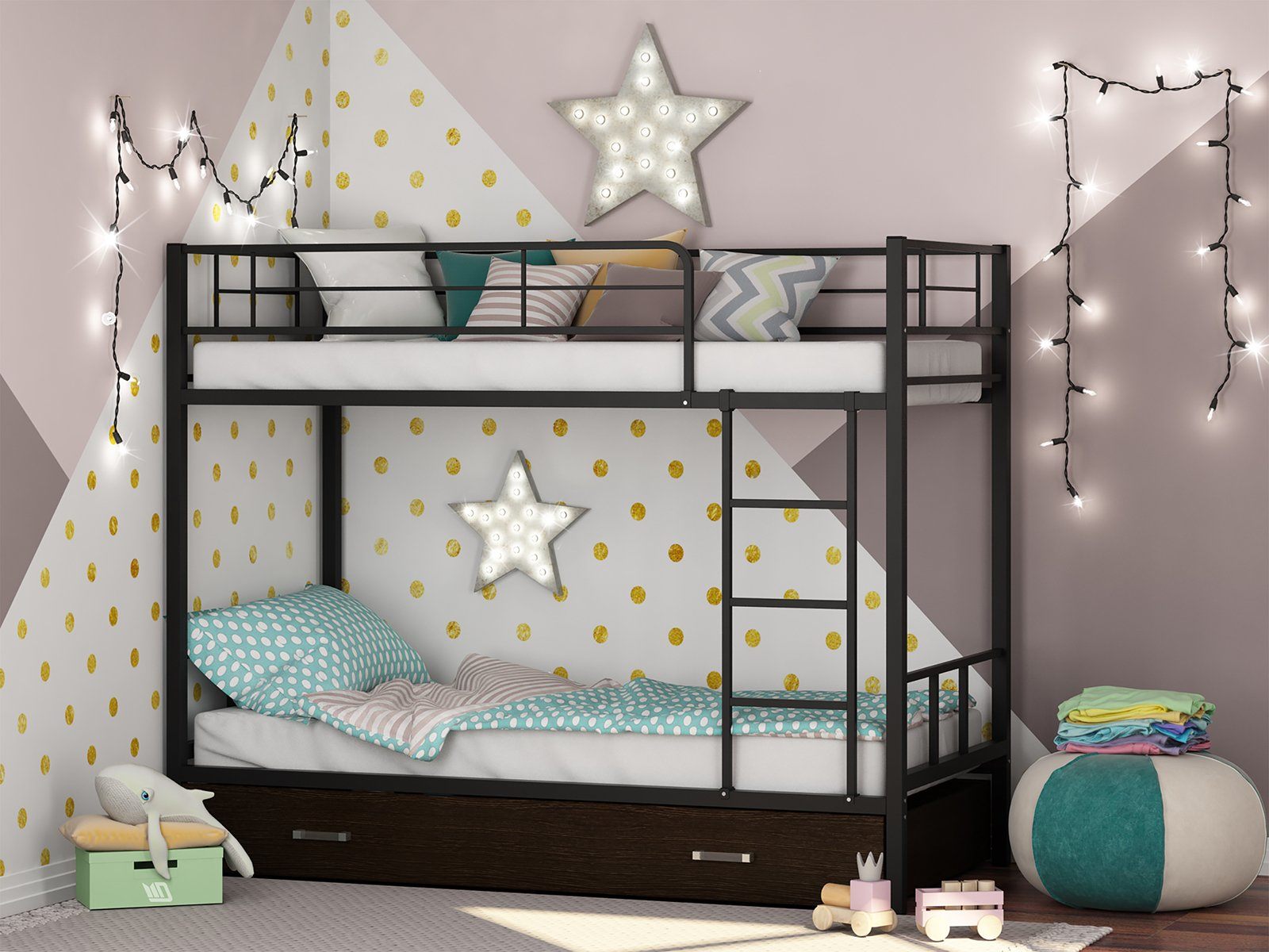 Металлическая двухъярусная кровать с ящиком Севилья-2Я для детей и взрослых, лестница расположена спереди способна выдерживать нагрузку до 180 кг (на одно спальное место), что делает ее подходящей как для детей, так и для взрослых. В отличие от кроватей из ЛДСП выглядит менее громоздкой. В комплект входит прочная лестница, которую по Вашему желанию можно установить справа или слева.