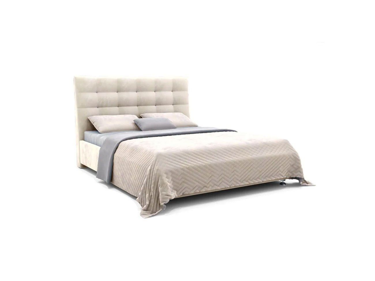 Современная модель среди интерьерных кроватей. Оригинальный рельеф изголовья, выполненный в виде квадратов с декоративной строчкой задает определенный ритм всему интерьеру спальни.