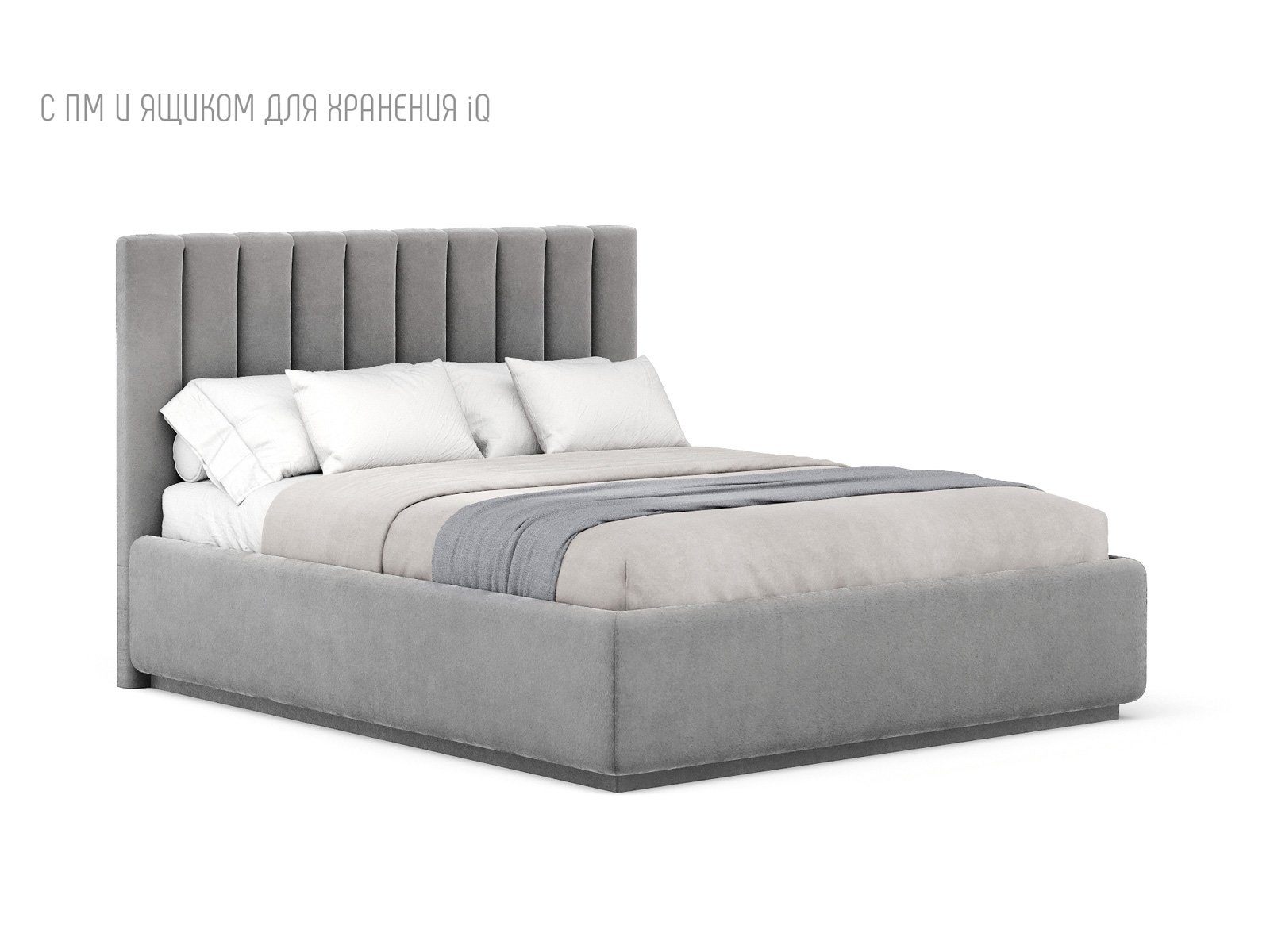 Кровать укомплектована IQ с подъемным механизмом и ящиком для белья без дна (дополнительная платная опция - дно к ящику IQ из HDF (ХДФ). Каркас кровати на цоколе, декоративный чехол на цоколе съёмный. Глубина ящика для белья - 30 см, без ограничения нагрузки на ящик.