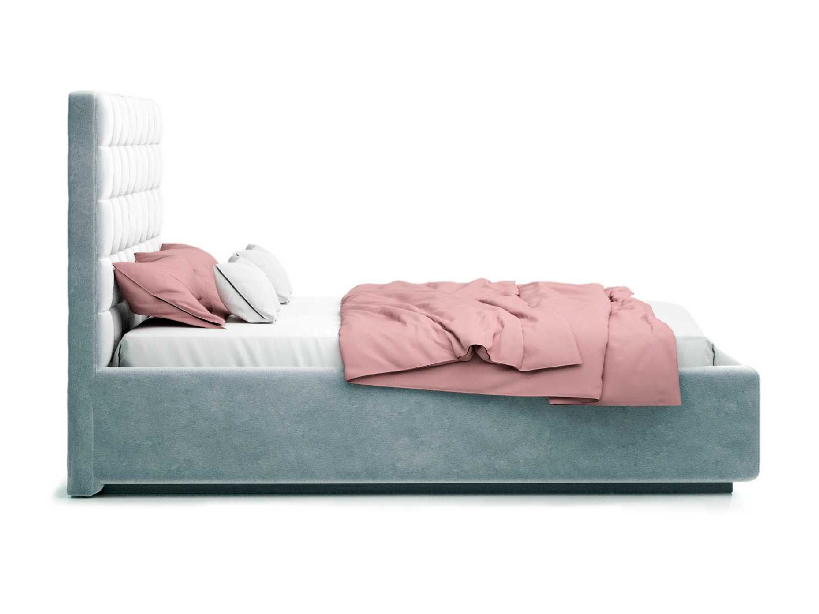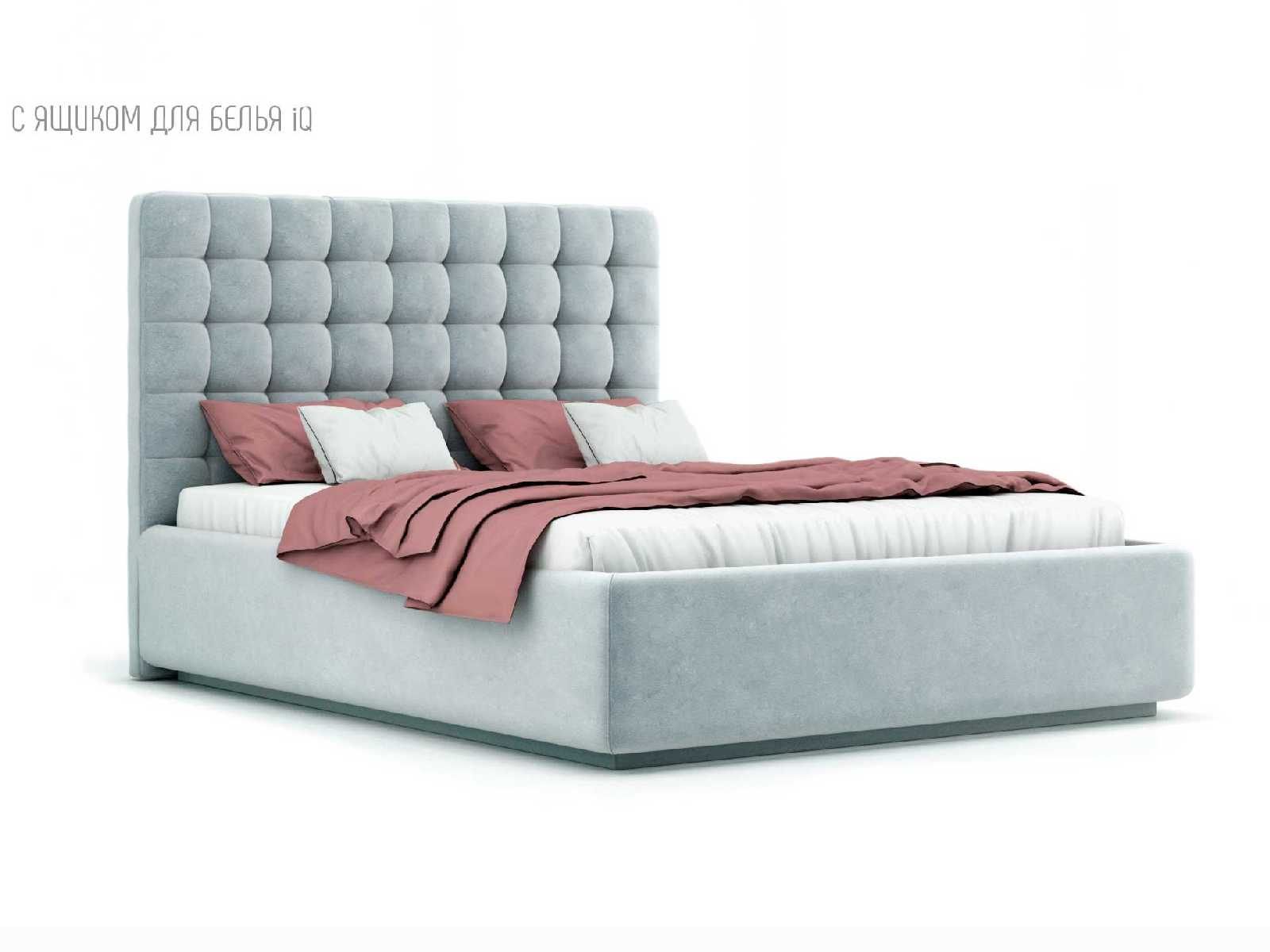 Кровать укомплектована IQ с подъемным механизмом и ящиком для белья без дна (дополнительная платная опция - дно к ящику IQ из HDF (ХДФ). Каркас кровати на цоколе, декоративный чехол на цоколе съёмный. Глубина ящика для белья - 30 см, без ограничения нагрузки на ящик.