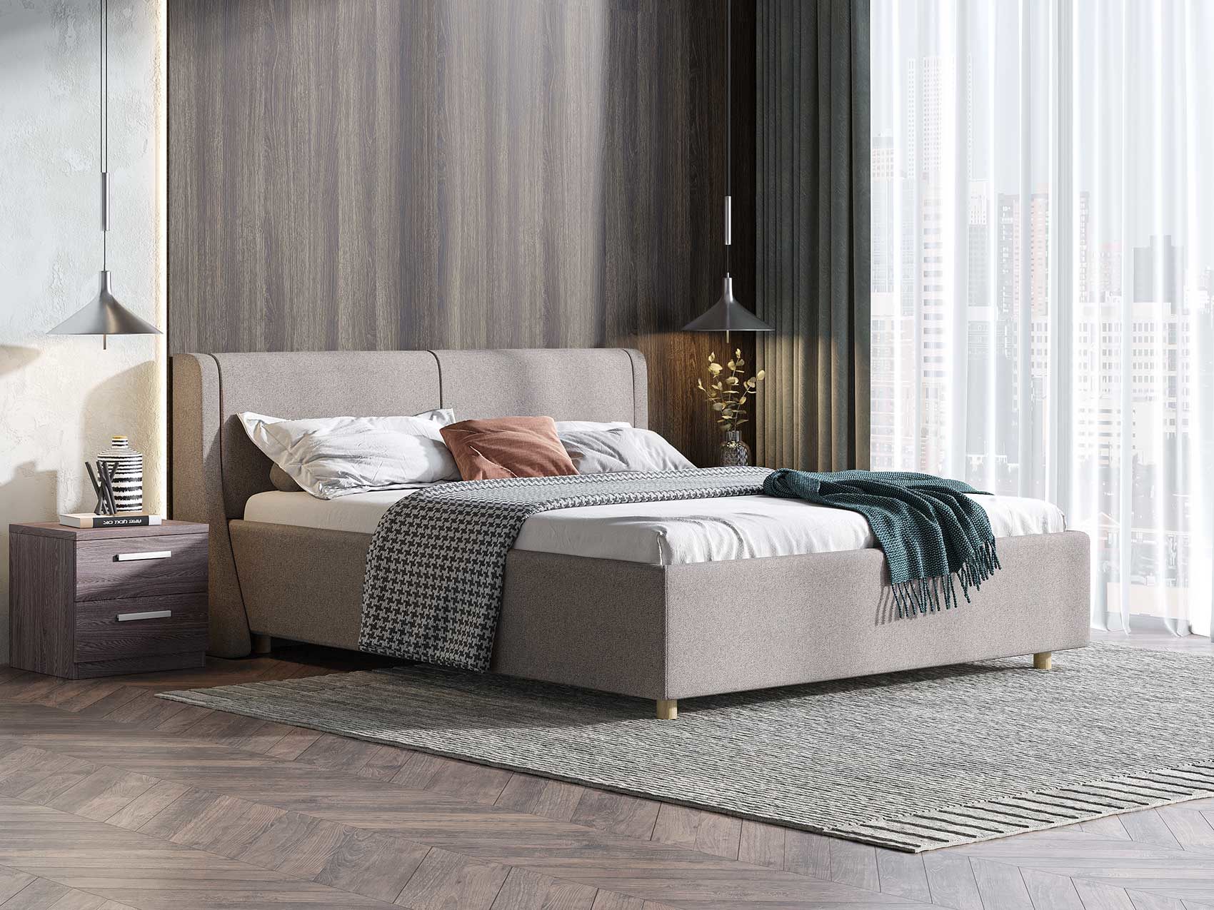 Кровать Barcelona подойдет для современных интерьеров спален, а благодаря деревянным ножкам впишется в стиль ретро, скандинавский или минимализм.