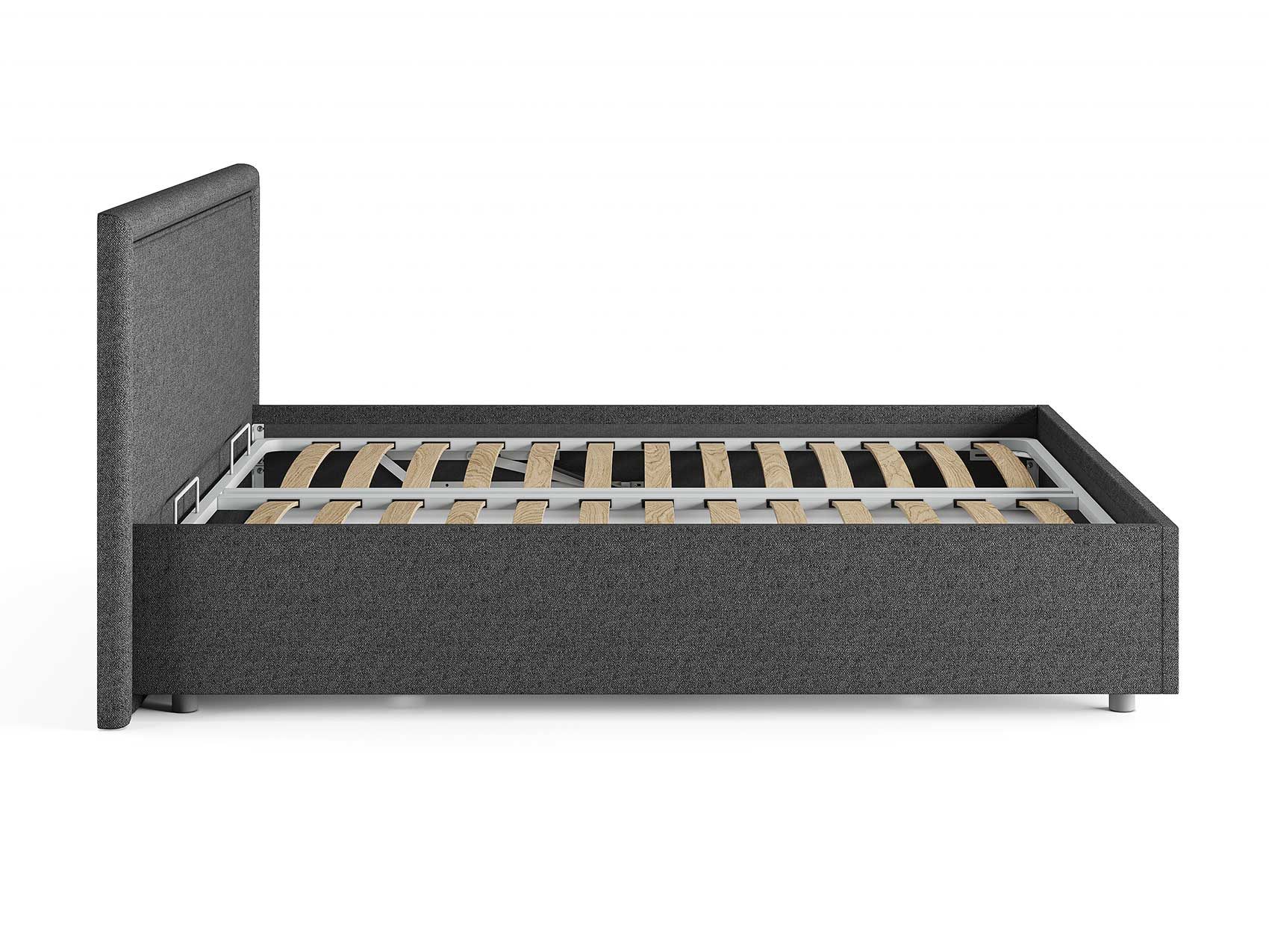 Элегантная интерьерная кровать с мягким изголовьем. Модель изготовлена из ДСП. Обратная сторона изголовья обита спандбондом, но её можно выполнить из основного обивочного материала. При необходимости кровать может быть укомплектована подъемным механизмом с бельевым ящиком или трансформируемым основанием Aquarius (размером 160-200).