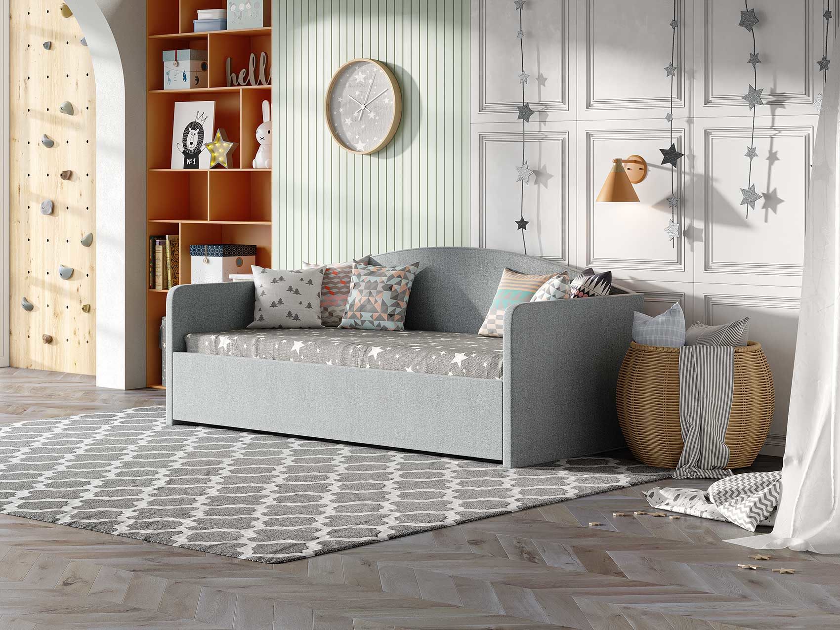 Кровать комплектуется металлическим основанием (без опор), которое имеет 13 рядов встроенных березовых ламелий на каждое спальное место, обеспечивая равномерное распределение нагрузки.