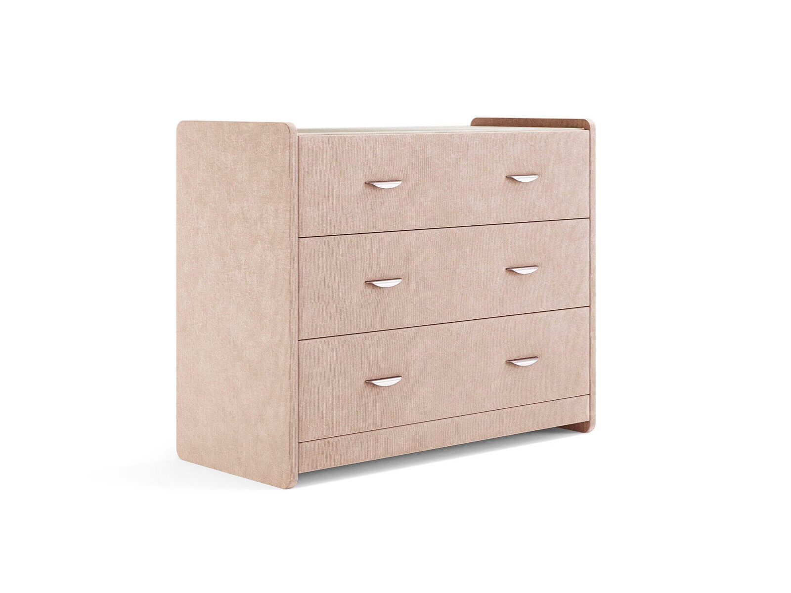 Современный и элегантный комод отличается повышенным удобством. Фасад ящиков и стенки комода покрыты обивочным материалом и выполняются в 43 вариантах цветового исполнения. Для удобства использования и продления срока эксплуатации, рекомендуется использовать стеклянную накладку. Накладка используется в качестве столешницы для тумбы и защищает ее от повреждений и загрязнений. Стеклянная столешница заказывается дополнительно.