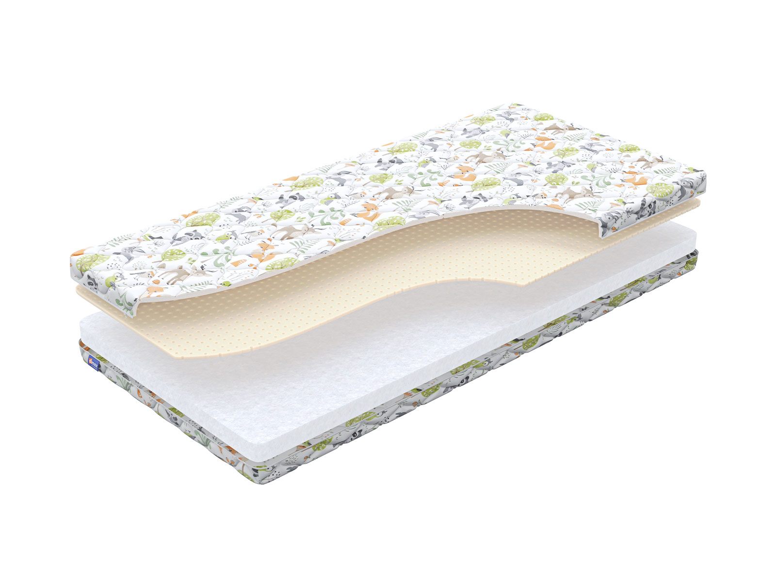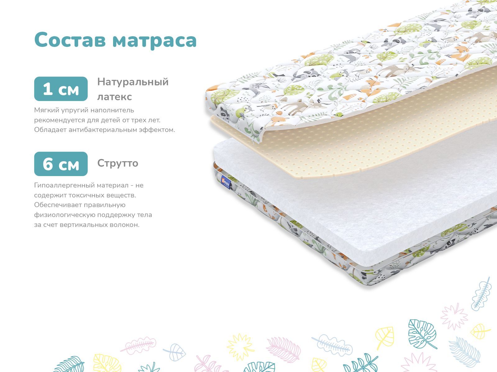 Внутри матраса лежат два вида наполнителей: струттофайбер и натуральный латекс. Оба материала зарекомендовали себя как качественные и безопасные. Они проверены временем и обеспечивают правильное положение тела ребенка на протяжении всего отдыха.