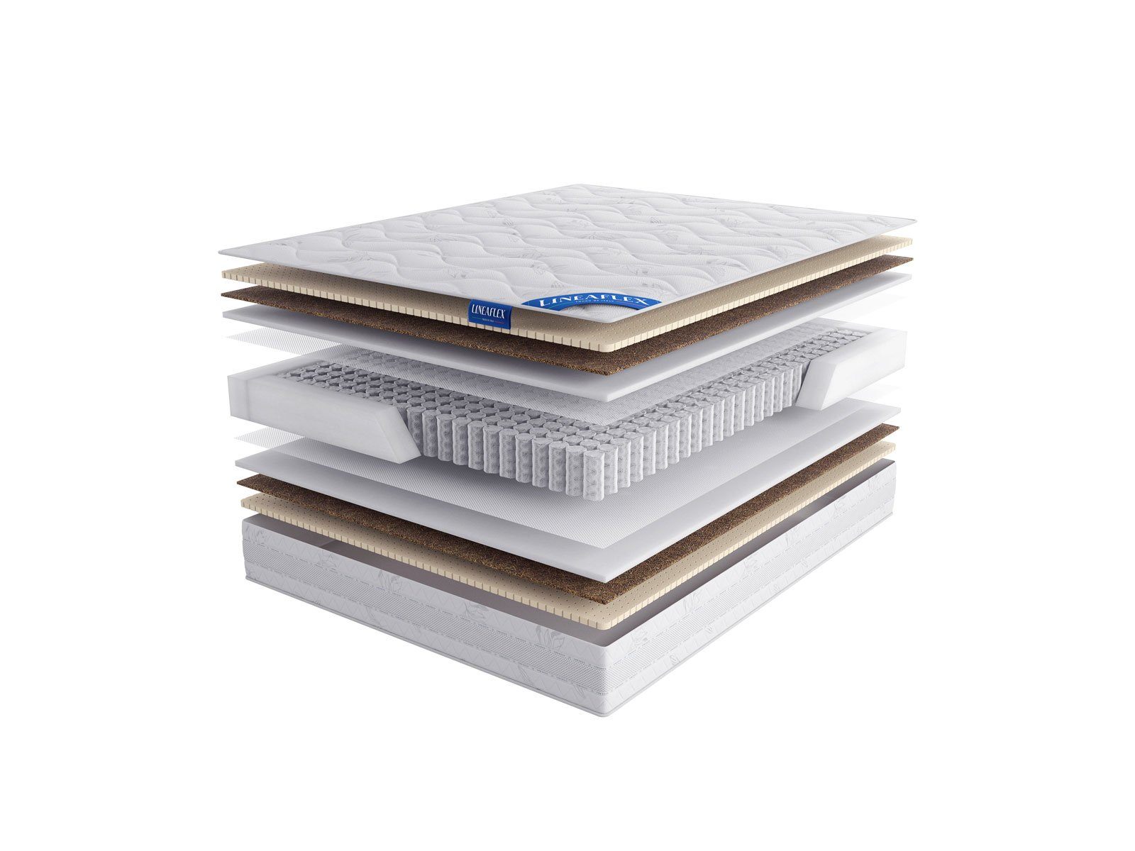 Первым установлен натуральный латекс – нежный и мягкий пенный слой природного происхождения. Эластичная плита до того пластична, что моментально начинает подстраивается под линии и формы, как только получает воздействие на свою поверхность. К тому же слой полностью проницаем для воздуха, а значит не позволяет застаиваться пыли, влаге и запахам внутри матраса.