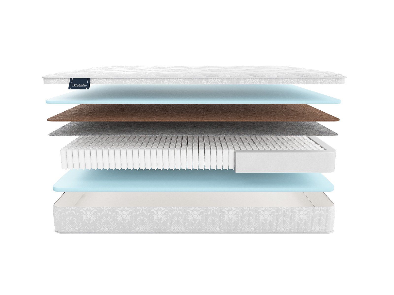 Первая сторона матраса укомплектована плотной и эластичной универсальной пеной natural foam (аналог натурального латекса) в комбинации с латексированным кокосом и термофиксированным фетром. Матрас ощущается плотным и устойчивым. Вторая сторона состоит из более плотной пены natural foam, благодаря которой увеличивается износостойкость матраса, а поверхность ощущается жестче. Для дополнительного комфорта матрас усилен каркасом 10 см по периметру, что дает ряд дополнительных преимуществ: он прекрасно держит вес, хорошо восстанавливается после нагрузки, а срок его службы становится больше.