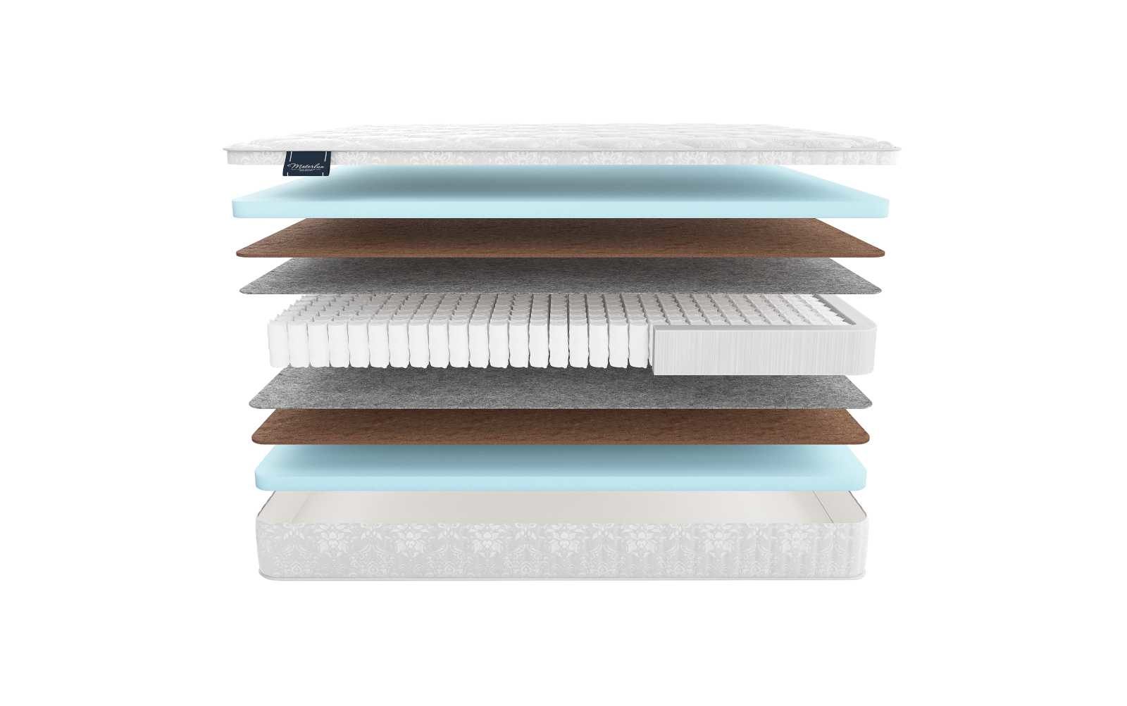 Наполнители, проложенные по сторонам от блока пружин, гарантируют более равномерное поступление веса на амортизирующую сердцевину. Пена Natural foаm смягчает стороны и даёт анатомическую подстройку матраса. Койра кокоса выравнивает рельеф пружин и хорошо удерживает тело человека.