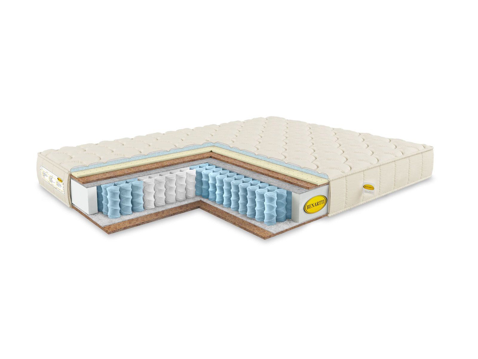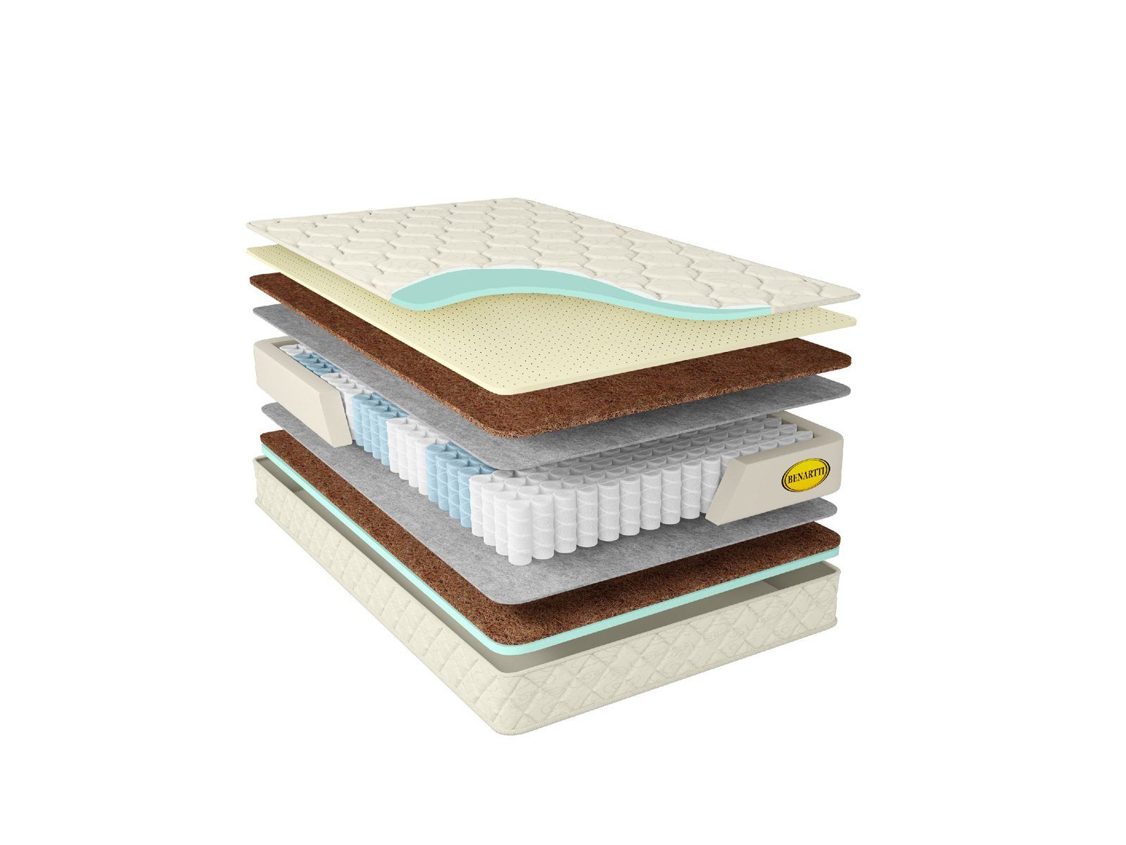 Внутри матраса установлен пружинный блок S1000 и различная комбинация наполнителей. У одной поверхности лежат сантиметровые слои кокосовой койры и натурального латекса, а у другой находится одна лишь плита кокоса. Так образуются различные уровни жёсткости сторон – средняя и умеренно жёсткая. Переворачивать изделие легко и удобно благодаря вшитым по бокам ручкам.