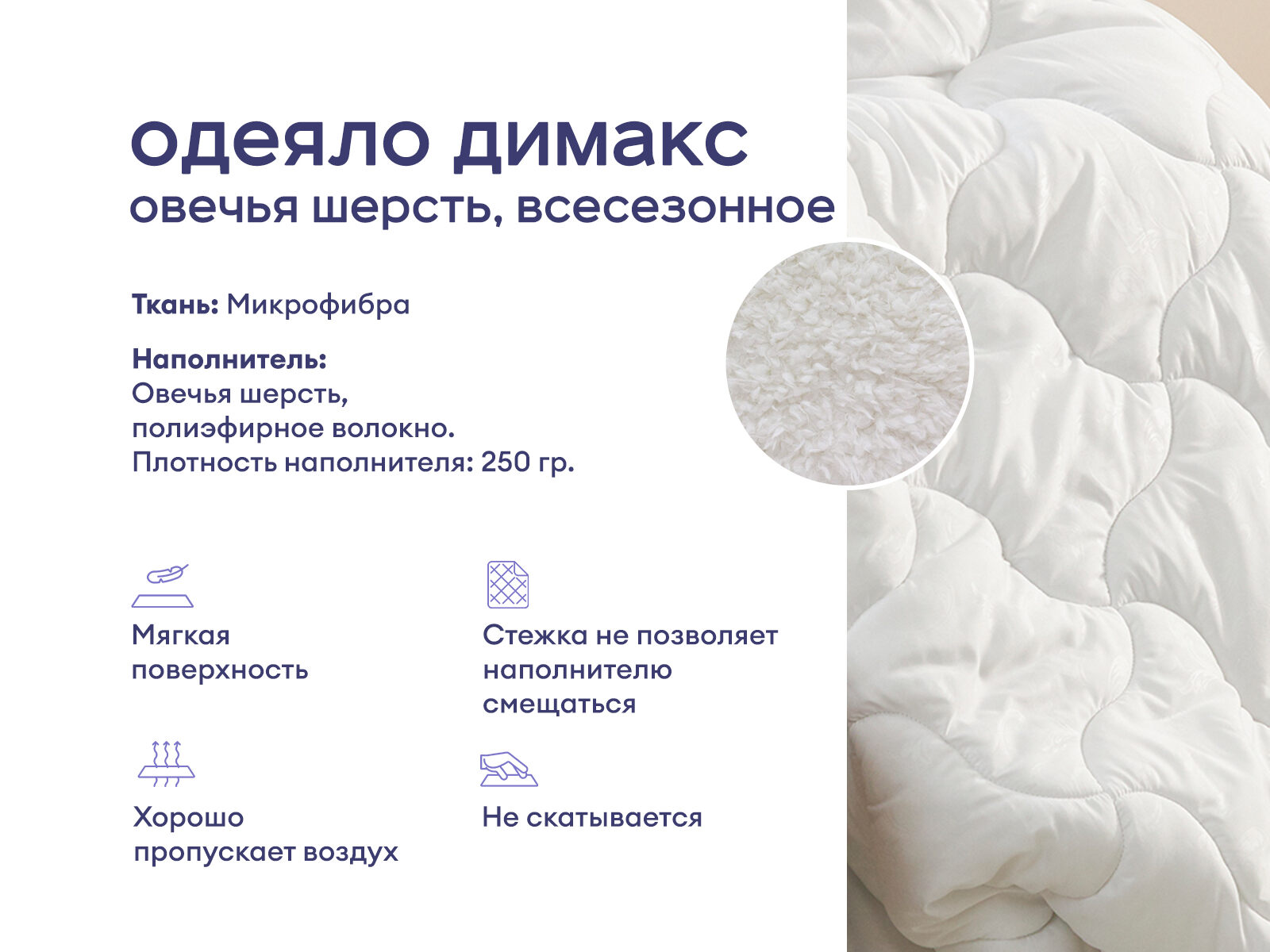 Комплект одеяло Димакс Овечья шерсть всесезонное + подушка Димакс Базис Макси 1 шт. Мечтаете о комфортном сне, который объединен «умным» теплом и точностью анатомической поддержки? Одеяло из овечьей шерсти дарит дышащее тепло, а подушка Базис Макси с волнообразной формой подстраивается под каждую линию вашего тела. Это не просто набор для сна — это система, которая заботится о вашем здоровье, даже когда вы отдыхаете. И всё это с экономией до 43%, если приобретать товары комплектом.