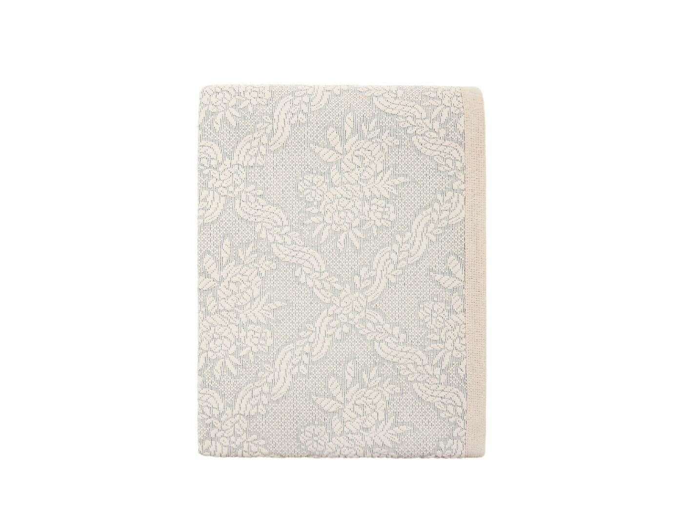 Покрывало "ILIA" изготовлено из 100% хлопка, однослойное, без подкладки. Ткань плотная и прочная, практически не мнется. В основе голубой цвет, узоры и отделка края выполнены в светлом оттенке экрю. Края покрывала отделаны тесьмой.