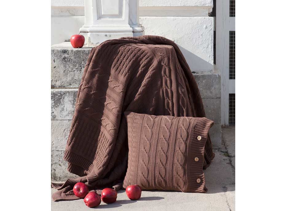 Чудесный плед "Imperio 233"- это 100% хлопок, итальянская пряжа, без добавления синтетики. Это машинная вязка. Имеет сложный дизайн - рапорт из толстых косичек и широкой полосы вывязанной корзиночки, хорошая плотная резинка.