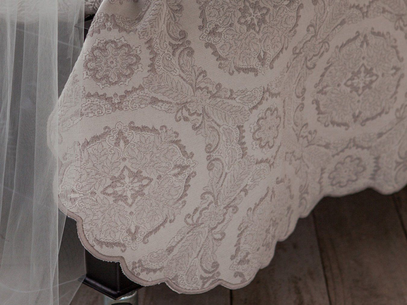 Покрывало "AMELIE" плотное, достаточно тяжелое, нежного льняного цвета. Оригинальное по дизайну: растительный узор дополняют изящные волнистые края.