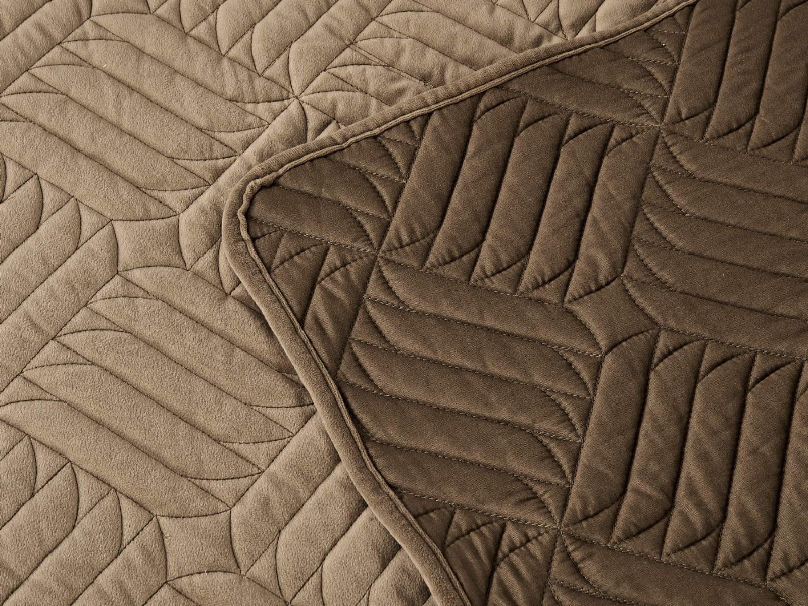 Покрывала выполнены в 10 оттенках: крем, мокко, пепельный, песочный, светло-бежевый, светло-серый, серый, темно-серый, чайная роза и черный. Стежка в виде геометрического орнамента подойдет к любому современному интерьеру. Из-за особого плетения, велюровая ткань покрывала отражает свет и красиво переливается при различном освещении.
