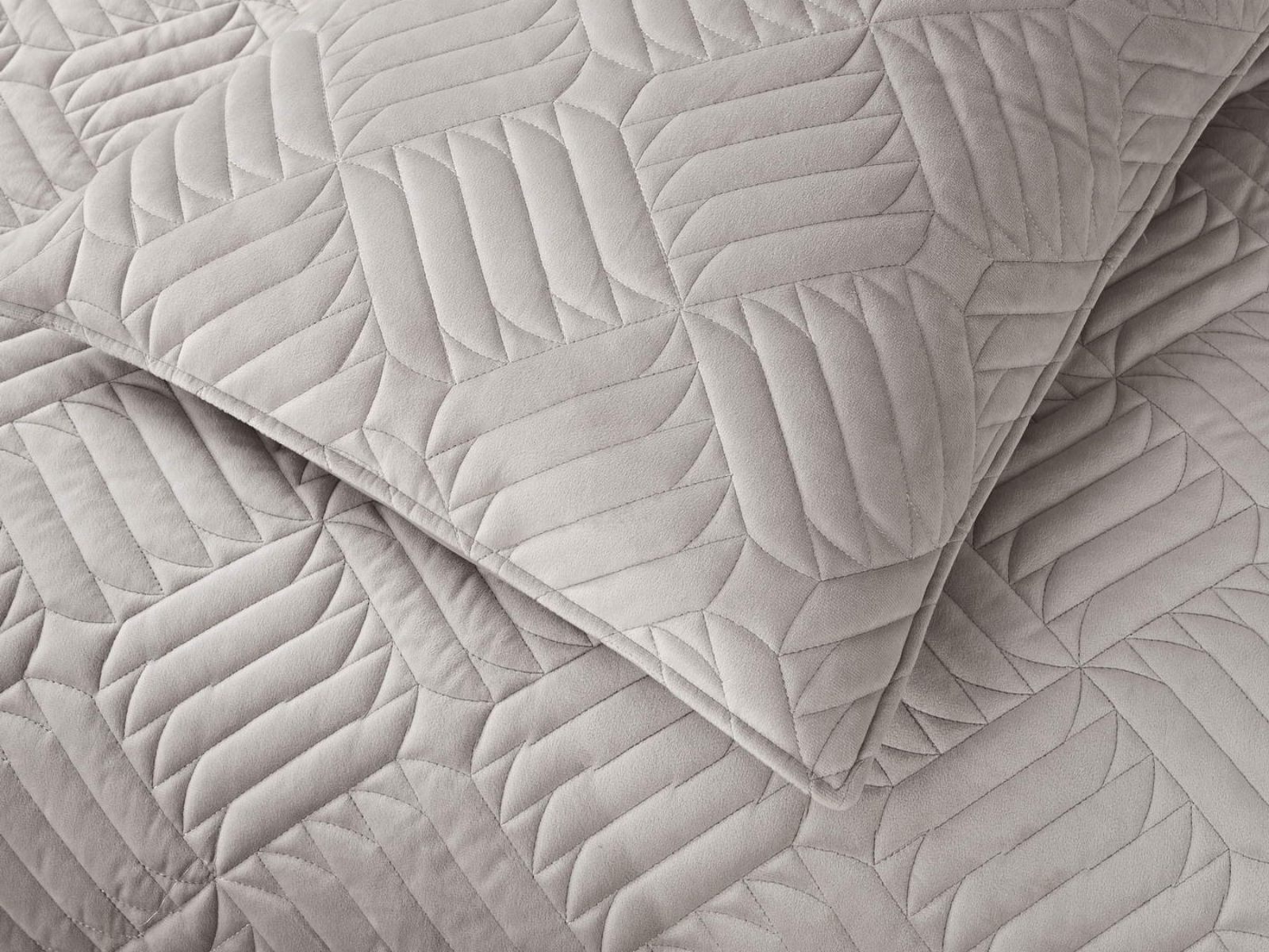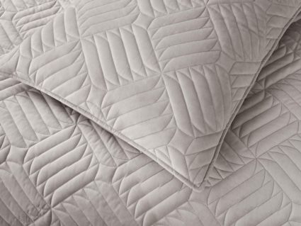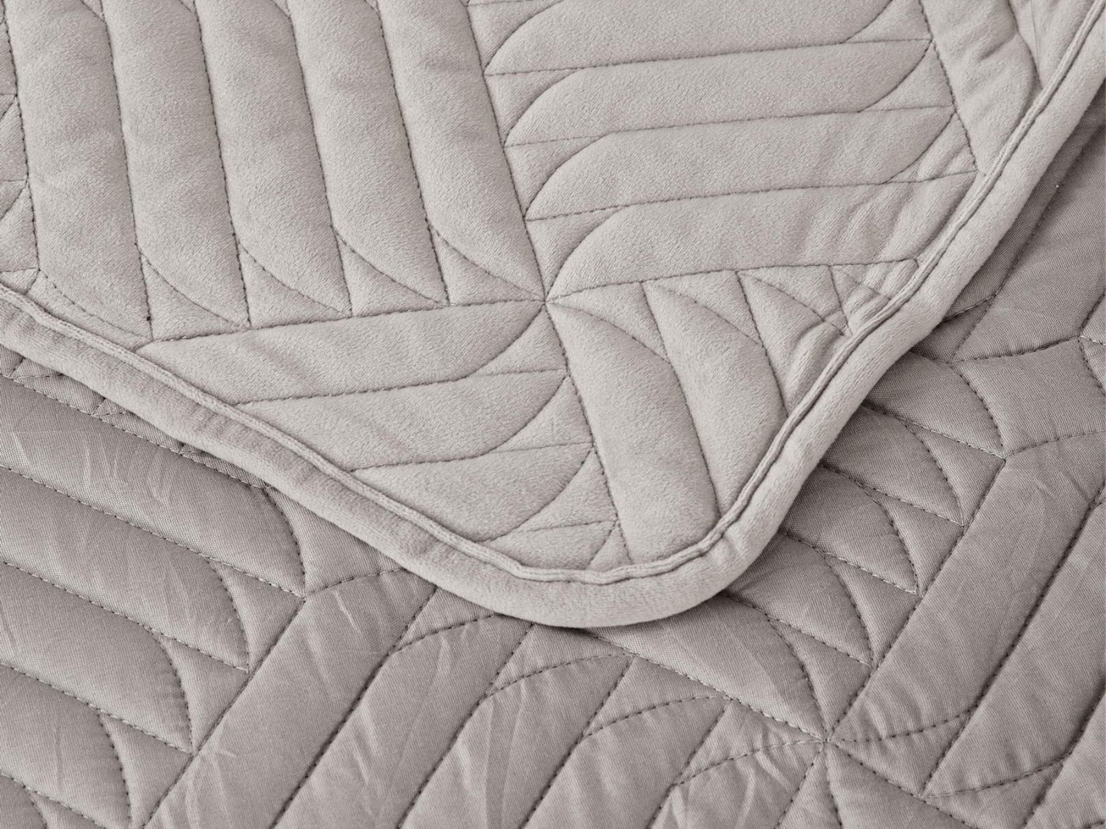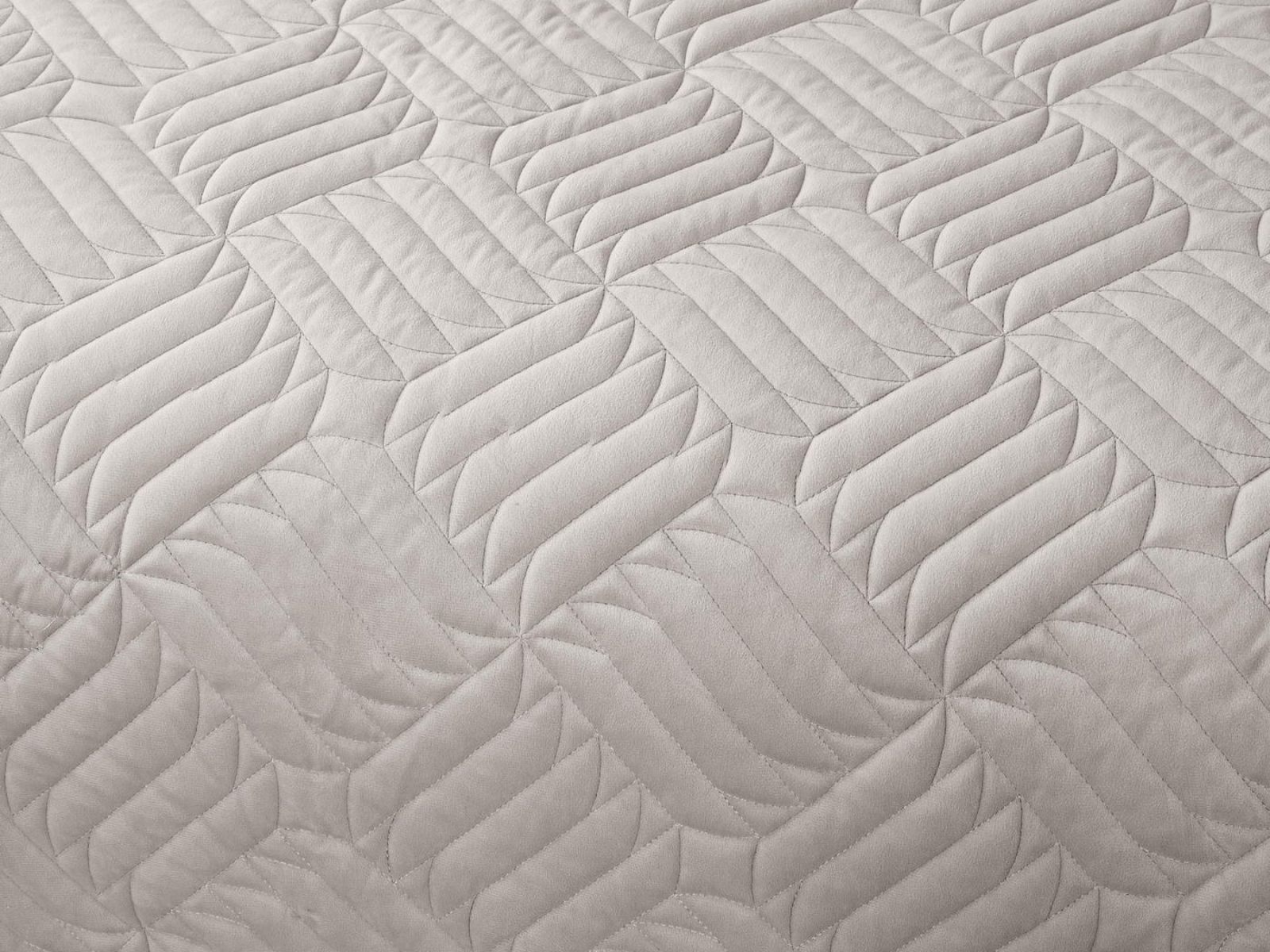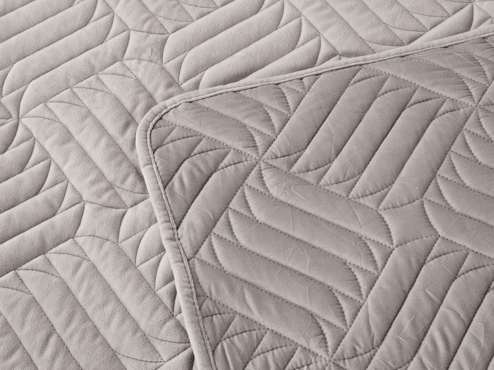 Покрывала выполнены в 10 оттенках: крем, мокко, пепельный, песочный, светло-бежевый, светло-серый, серый, темно-серый, чайная роза и черный. Стежка в виде геометрического орнамента подойдет к любому современному интерьеру. Из-за особого плетения, велюровая ткань покрывала отражает свет и красиво переливается при различном освещении.