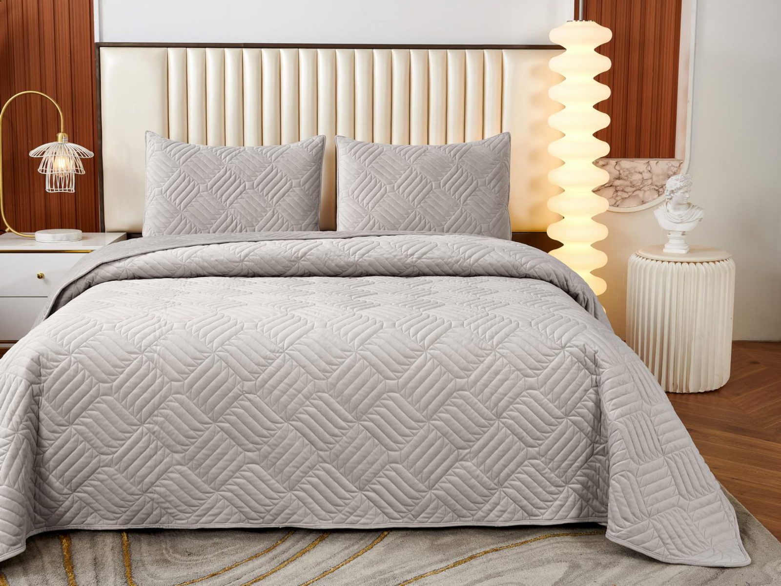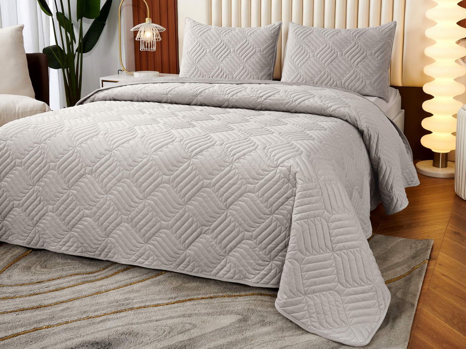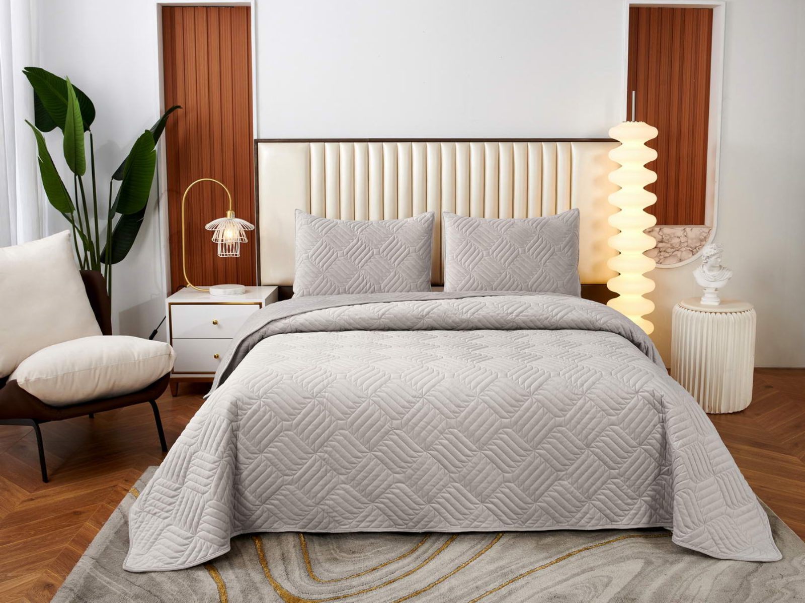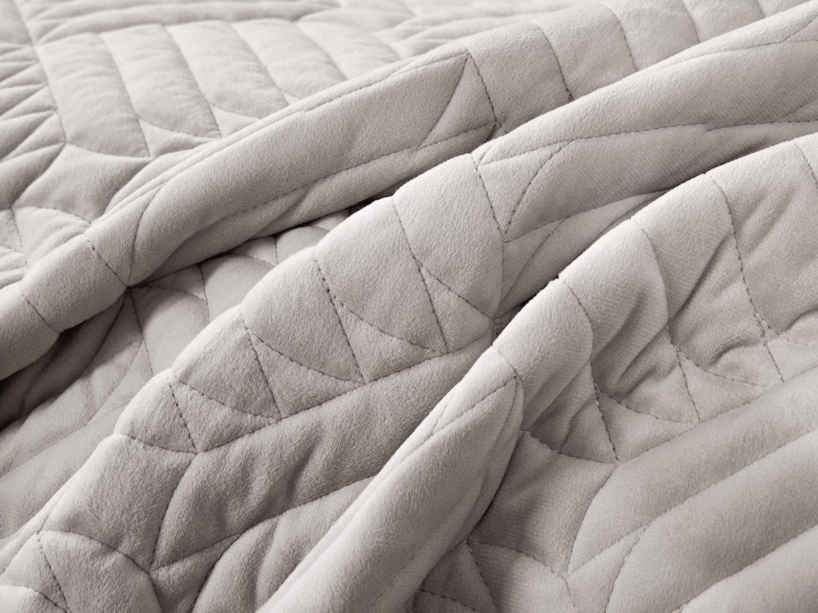 Покрывала выполнены в 10 оттенках: крем, мокко, пепельный, песочный, светло-бежевый, светло-серый, серый, темно-серый, чайная роза и черный. Стежка в виде геометрического орнамента подойдет к любому современному интерьеру. Из-за особого плетения, велюровая ткань покрывала отражает свет и красиво переливается при различном освещении.