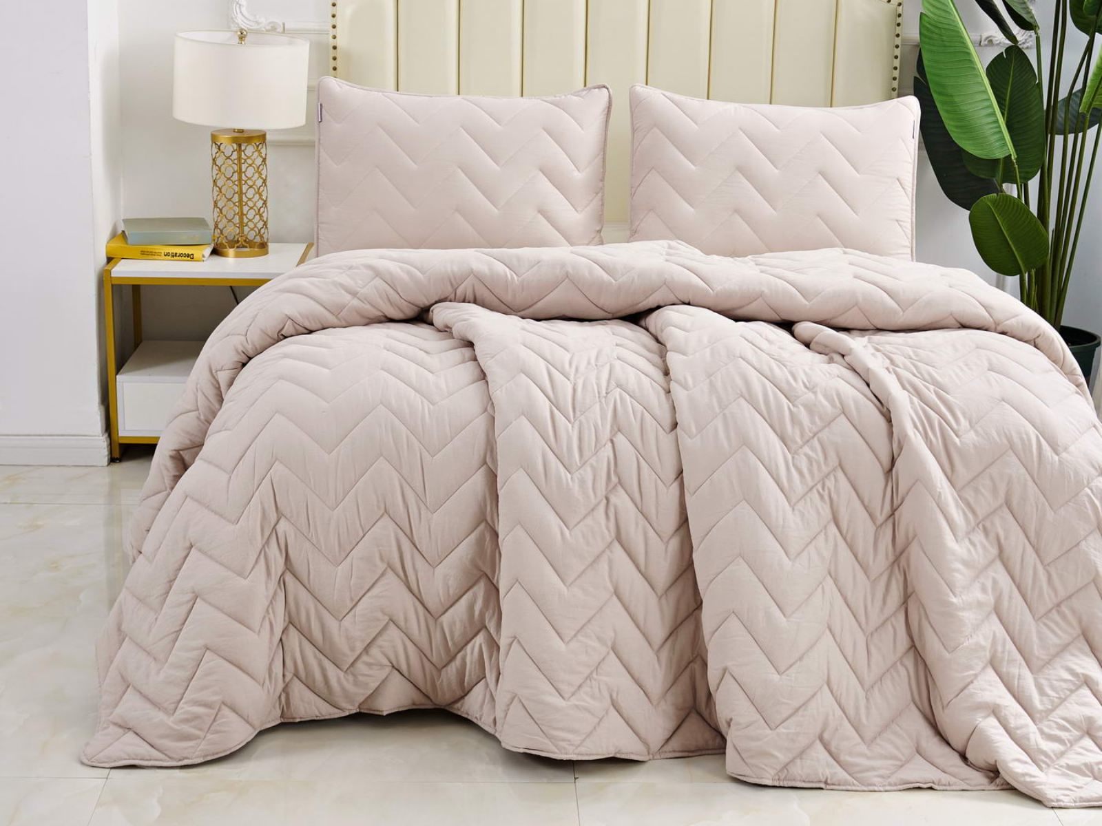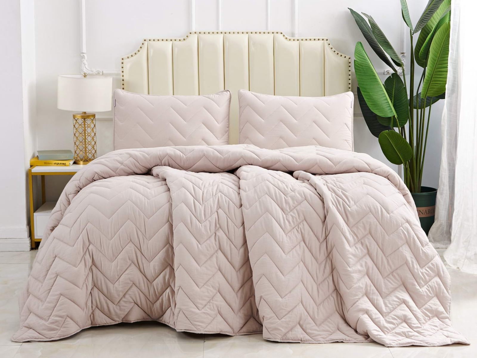 В комплект входят покрывало и одна либо две наволочки (50х70 см) из аналогичного материала в зависимости от размера. Изделия гипоаллергенны, они подходят детям и людям с чувствительной кожей. Покрывала и наволочки не линяют, сохраняют форму и цвет при многочисленных стирках и не выгорают на солнце. Изделия можно стирать в щадящем режиме при температуре не выше 30 градусов.