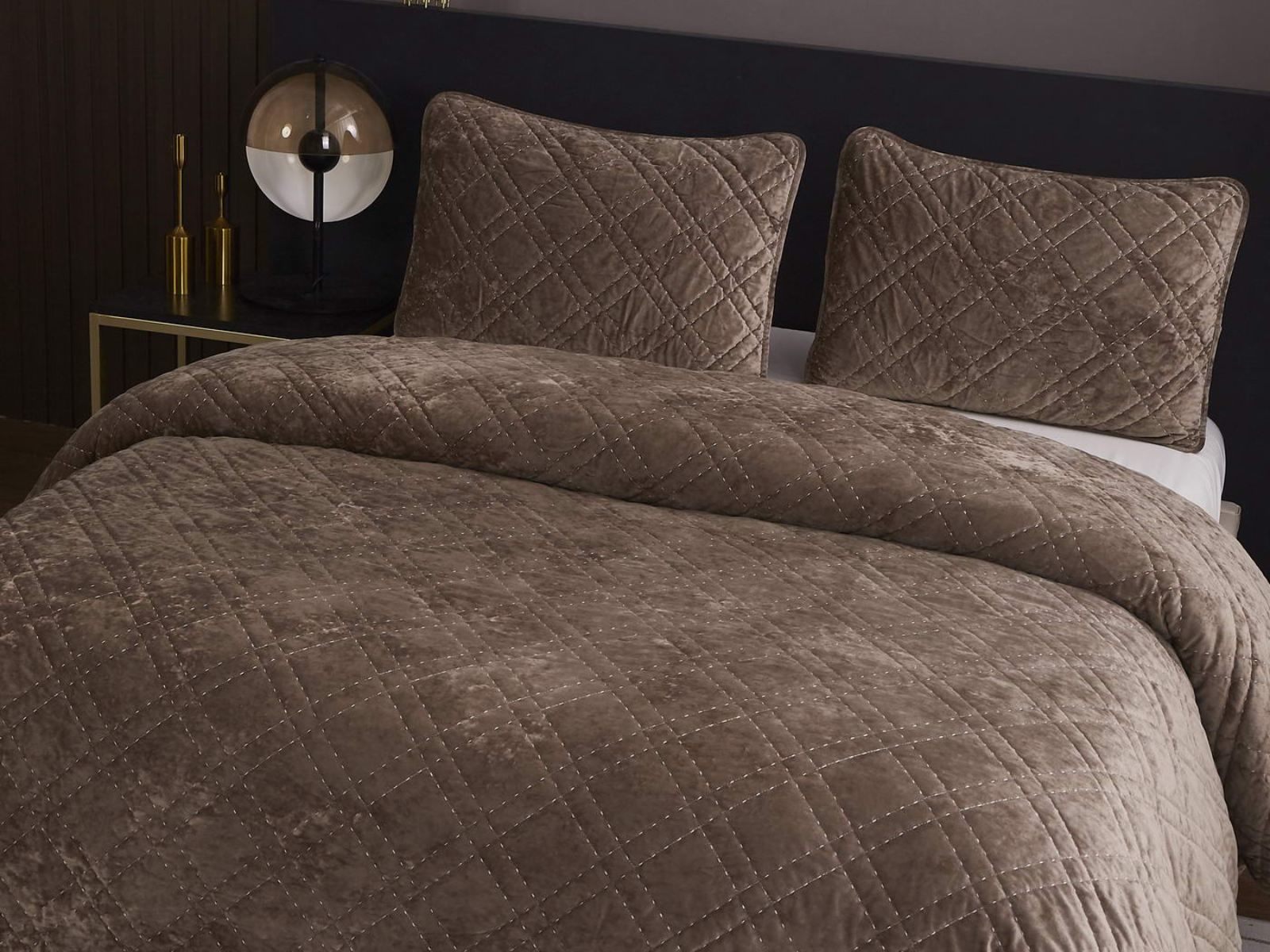 Покрывало Селена выполнено в девяти оттенках: пудра, антрацит, беж, изумруд, капучино, пепел роза, серебро, стоун, терракот. Они подойдут практически для любого интерьера, от классического, до модерна или романтического. Стеганое бархатное покрывало будет необыкновенно смотреться на вашей постели. В комплект входят покрывало и одна либо две наволочки (50х70 см) из аналогичного материала в зависимости от размера.