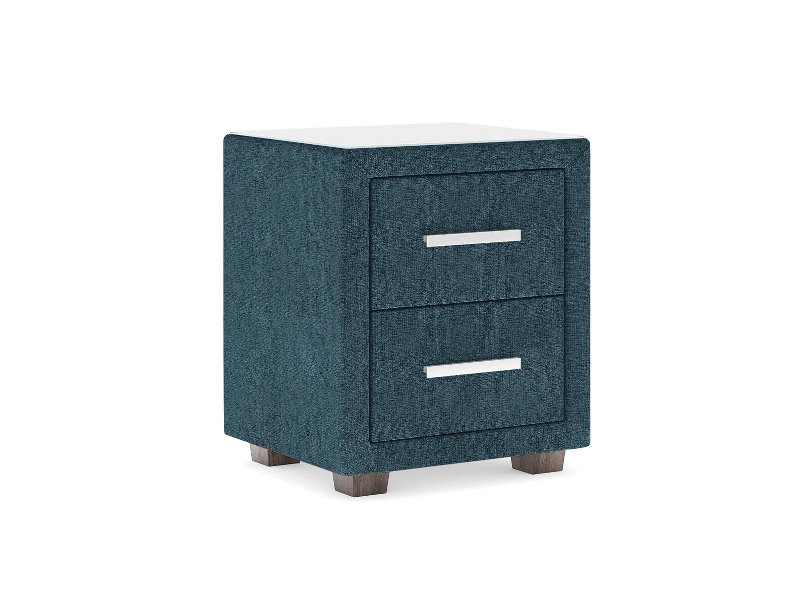 Прикроватная тумба с двумя выдвижными ящиками сочетается с любыми моделями кроватей, органично вписывается в интерьер практически любого стиля. Каркас тумбы выполнен из ДСП. Каркас тумбы и фасад ящиков покрыты обивочным материалом. Для удобства использования и продления срока эксплуатации, рекомендуется использовать стеклянную накладку. Накладка используется в качестве столешницы для тумбы и защищает ее от повреждений и загрязнений. Стеклянная столешница заказывается дополнительно.