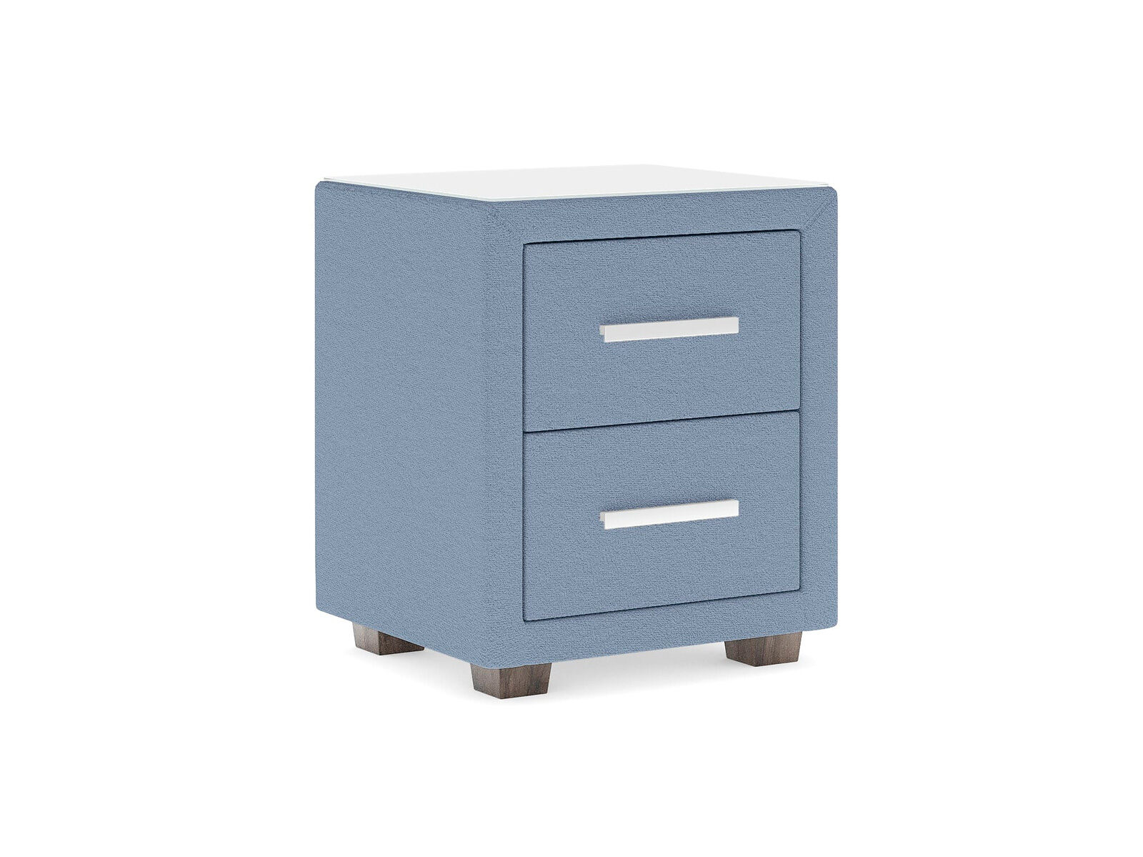Прикроватная тумба с двумя выдвижными ящиками сочетается с любыми моделями кроватей, органично вписывается в интерьер практически любого стиля. Каркас тумбы выполнен из ДСП. Каркас тумбы и фасад ящиков покрыты обивочным материалом. Для удобства использования и продления срока эксплуатации, рекомендуется использовать стеклянную накладку. Накладка используется в качестве столешницы для тумбы и защищает ее от повреждений и загрязнений. Стеклянная столешница заказывается дополнительно.