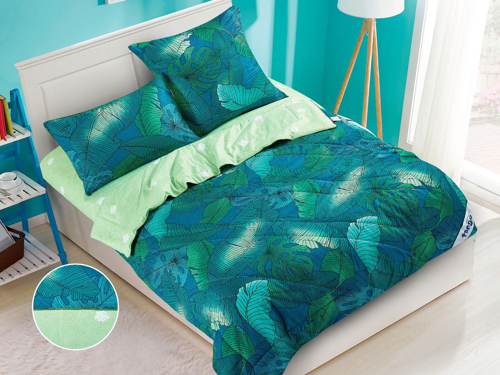 В данный комплект вместо пододеяльника входит облегченное одеяло. Комплект подойдет тем, кто устал от мучительного натягивания пододеяльников на одеяло.