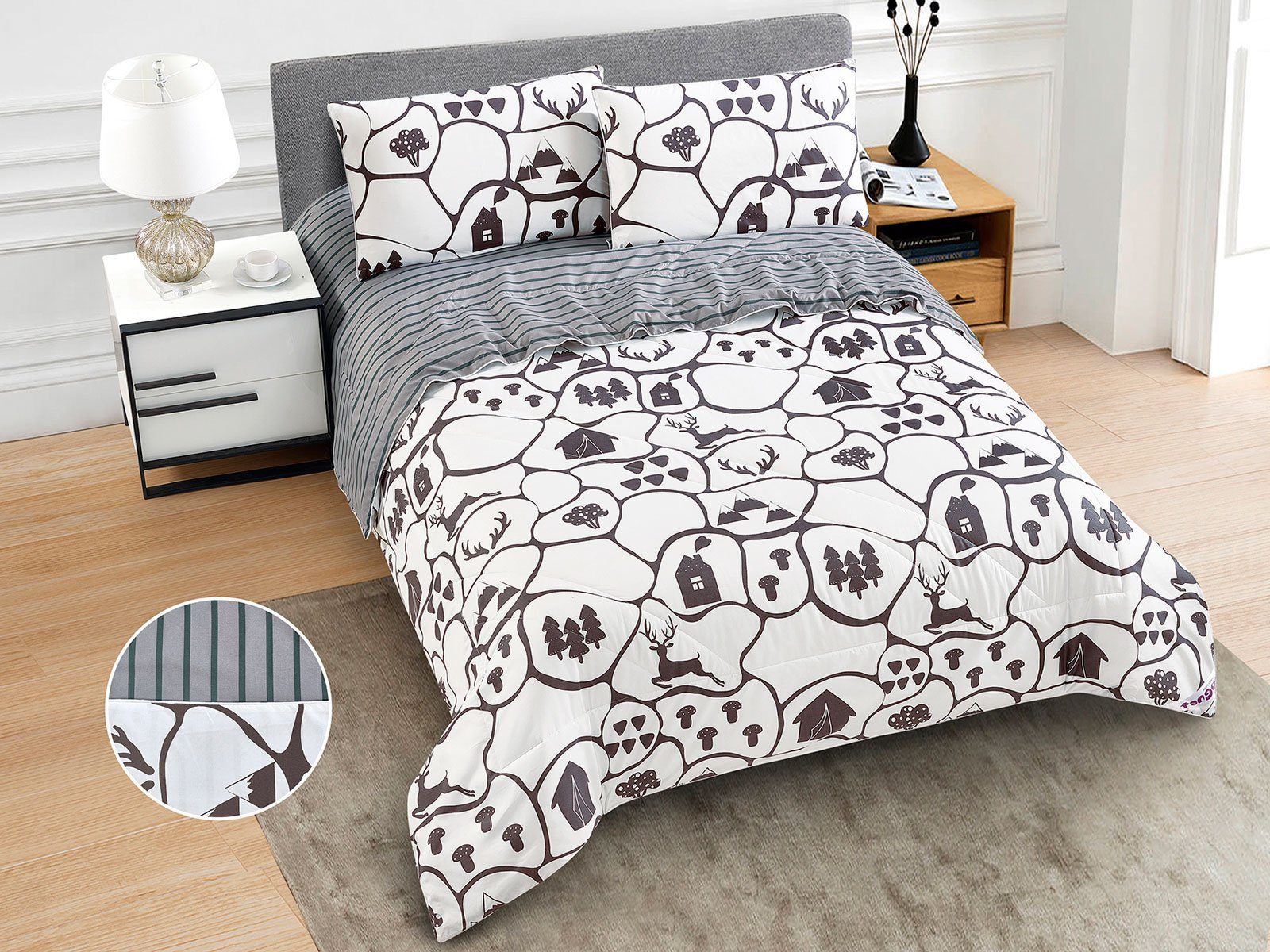 В данный комплект вместо пододеяльника входит облегченное одеяло. Комплект подойдет тем, кто устал от мучительного натягивания пододеяльников на одеяло.